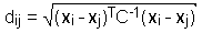 Die Mahalanobis-Distanz ist mit der euklidischen Distanz verwandt; für unkorrelierte, standardisierte Daten sind die beiden gleich. Sie kann leicht durch Einbeziehen der inversen Kovarianzmatrix C-1 in die Distanzberechnung errechnet werden: