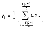 Die folgende Gleichung stellt die allgemeine Filtergleichung nach Savitzky und Golay dar. Das konkrete Verhalten des Filters kann durch Verwenden geeigneter Koeffizienten eingestellt werden. So kann man durch bloßes Anpassen der Koeffizienten sowohl eine gleitende Mittelwertsbildung, als auch eine Polynomialglättung, oder eine geglättete Ableitung erzeugen. Der Parameter np definiert die Anzahl der Werte, die für die Glättung verwendet werden.
