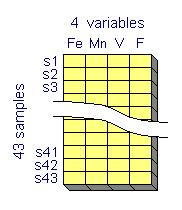 Data MatricesWhen you are measuring data in your lab, you finally have a data matrix which contains a certain number of rows and columns. The data is usually arranged in such a way, that each row of the data matrix contains all measurements on a single data object. The rows therefore represent the objects, or samples, whereas the columns represent the variables, or descriptors.