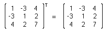 More simply expressed, we just write the rows as columns, and vice versa. This results in a mirroring along the 45° line (which is equivalent to a mirroring of the columns and a consecutive counterclockwise rotation). Here is an example: ![]() It is evident that MTT equals M, where