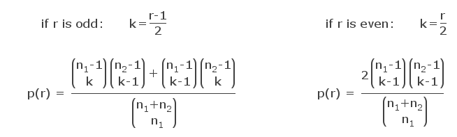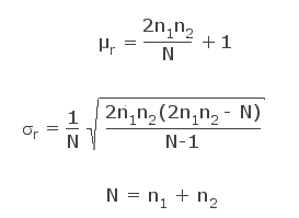 If we look at a sequence of binary random numbers (e.g. 00101110110111000100110) we may pose the question how many "runs" (sub-sequences consisting of all-ones or all-zeroes) normally occur in a random sequence of a certain number of zeroes and ones. A small number of runs indicates a mixing which is not thorough enough, while a number of runs which is too high points to systematic ordering effects in the sequence. If the number of actually detected runs differs too much from the number of expected runs this may raise the suspicion that the sequence is not random. The example sequence above can be divided into the following runs: 00 | 1 | 0 | 111 | 0 | 11 | 0 | 111 | 000 | 1 | 00 | 11 | 0 The random sequence contains 13 runs with a total of 23 random numbers (11 zeroes, and 12 ones). In order to decide whether the number of found runs is improbable (i.e. the probability that this particular number of runs to occur is below the level of significance) one first has to determine the distribution of runs as a function of the counts of zeroes and ones (n1 and n2). This distribution may be derived from combinatorial calculations. From these considerations we can infer that the probability p(r) of observing r runs, given n1 and n2, can be calculated as follows: