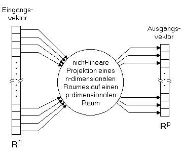 Neueinsteiger in den Bereichen der multivariaten Datenanalyse und der neuronalen Netzwerke nehmen oft an, ein künstliches neuronales Netzwerk (ANN) sei eine Art magische schwarze Box, in die man Daten eingibt und dann eine Lösung erhält. Obwohl diese Sichtweise gefährlich sein kann, ist doch ein Körnchen Wahrheit darin enthalten. Wir können ein ANN als eine abstrakte Maschine ansehen, die eine nicht lineare Projektion zwischen einem n-dimensionalen Eingangsdatenraum und einem p-dimensionalen Ausgangsraum entwirft. n ist normalerweise sehr viel größer als p; und p liegt oft im Bereich zwischen 1 und 3 (weil die menschliche Denkweise auf eine maximale Dimension von 3 oder 4 beschränkt ist).