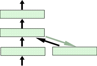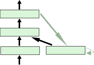 Netzwerke mit Feedbackschleifen gehören zur Gruppe der rekursiven Netzwerke. Bei diesen Netzwerken wird die Aktivierung der Neuronen nicht nur an die nächste Schicht weitergegeben, sondern auch an die Schicht davor, wodurch sich die Möglichkeit eines zyklischen Signalflusses ergibt. Zumindest theoretisch erlaubt das, eine unlimitierte Anzahl an vergangenen Aktivitäten in Berechnung des momentanen Signals mit einzubeziehen. Praktisch nimmt der Einfluss vergangener Eingangssignale jedoch rapide (exponentiell) ab. Die Geschwindigkeit der Abnahme kann zwar reguliert, aber nach ein paar Schritten die ursprüngliche Information nicht mehr erkannt werden. Rekursive Netzwerke sollten mit einem Trainingsalgorithmus trainiert werden, der den Fehler "rückwärts durch die Zeit" fortpflanzt. Diese Konsequenz ergibt sich aus einer Serie von vergangenen Eingaben, die einen Einfluss auf spätere Ausgaben haben. Man kann sich von dieser Technik ein Bild machen, indem man das Netzwerk mit dem Zeitfaktor darstellt [Hertz et al., 1991]. Diese Technik wird im BPTT-Algorithmus (Back Propagation Through Time) verwendet. Weil der Aufwand, den Fehler rückwärts durch die Zeit fortzupflanzen, sehr hoch ist, wird der zeitliche Aspekt während des Trainings oft ignoriert. Einfache rekursive NetzwerkeEin typisches Beispiel für einfache regressive Netzwerke ist das Elman-Netzwerk.