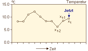 Eine Zeitreihe besteht aus mehreren Werten, die chronologisch angeordnet sind. Zum Beispiel könnte die resultierende Zeitreihe der Außentemperatur, die jeden Morgen um 8 Uhr gemessen und aufgeschrieben wird, folgendermaßen aussehen: 8°C, 8°C, 11°C, 12°C, 10°C, 8°C, 8°C, 6°C, 8°C, 9 °C