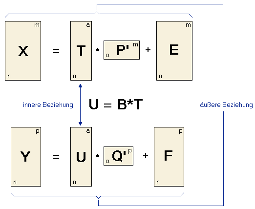 Dazu zerlegt man die Matrix X in eine Matrix T (die "Score"-Matrix) und eine Matrix P' (die "Loadings"-Matrix) plus einer Fehlermatrix E. Die Matrix Y wird in die Matrizen U und Q und den Fehlerterm F zerlegt. Diese zwei Gleichungen nennt man die "äusseren Beziehungen". Das Ziel von PLS ist es, die Norm von F zu minimieren und gleichzeitig eine Korrelation zwischen X und Y zu erhalten, in dem die Matrizen U und T in Beziehung zueinander gesetzt werden: U = BT. Diese Gleichung nennt man auch die "innere Beziehung". Ein wichtiger Punkt bei PLS ist die Entscheidung darüber, welche Zahl von Hauptkomponenten in die PLS-Berechnung einbezogen wird. Während das bei anderen Verfahren über Variationskriterien entschieden werden kann, muss die optimale Zahl der Hauptkomponenten bei PLS empirisch mit Hilfe der Kreuzvalidierung bestimmt werden. Das Modell mit dem kleinsten PRESS kann als das "beste" Modell angesehen werden. Bitte beachten Sie, dass es einige verschiedene Algorithmen zur Berechnung von PLS-Modellen gibt, die unterschiedliche Namen haben und kleine Unterschiede in den Ergebnissen liefern. Ein iteratives Verfahren das oft verwendet wird ist der so genannte NIPALS-Algorithmus ("nonlinear iterative partial least squares"), der eine Version der Potenzmethode zur Extraktion von Eigenwerten darstellt. PLS-Modelle können auch mit Hilfe der SVD berechnet werden, die im allgemeinen wesentlich schneller als der NIPALS-Algorithmus sind.