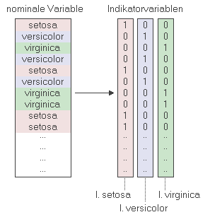Aufspaltung von nominalen bzw. ordinalen Variablen: Enthält eine Variable die Beschreibung mehrerer Zustände, in dem jedem Zustand z.B. eine Nummer zugeordnet wird, so ist diese Variable zum direkten Einsatz in statistischen Modellen mehr oder minder unbrauchbar, da im Fall einer nominal skalierten Variable diese nicht direkt in einem Modell eingesetzt werden kann und selbst bei ordinal skalierten Variablen der Einsatz in statistischen Modellen stark eingeschränkt sein kann. Man hilft sich in solchen Fällen, in dem man die verschiedenen Zustände einer solchen Variablen in eine entsprechende Zahl an Indikatorvariablen aufspaltet. Dabei enthält jede Indikatorvariable jeweils 1 oder 0, je nach dem, ob der jeweilige Zustand auftritt oder nicht.
